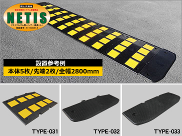 ゴム製減速帯 減速くん TYPE 3 <本体><先端> 商品コード: OTH-TYPE-031-A ~ SF-2ES-3 販売価格:¥ 4,840 ~ ¥ 15,730(税込) ゴム製減速帯 減速くん TYPE 3 バリエーション選択してください【アスファルト用】TYPE3 本体【コンクリート用】TYPE3 本体【アスファルト用】TYPE3 先端(オス)【コンクリート用】TYPE3 先端(オス)【アスファルト用】TYPE3 先端(メス)【コンクリート用】TYPE3 先端(メス)2液性エポキシ接着剤<1袋・1Kg> 数量: ★高さが32mmに押さえており、衝撃・騒音面でソフトな通行ができるゴム製減速帯です。 ★高さをおさえたゴム製減速帯なので不必要な衝撃を車両に与えたくない箇所に最適です。 高さが32mmと低いので通過時の衝撃を緩和させることが可能なタイプ。衝撃が低く速度抑制効果があるので高速道路のETCレーンにも採用。速度超過でレーンに侵入する車両の速度抑制に貢献しておりETCレーンのバーへの車両接触による破損も減少しています。 ※設置用アンカー付属 ※本体複数枚に先端2枚を組み合わせてご使用ください。(設置参考例:本体5枚/先端2枚/全幅2,800mm) 滑り止め対策として表面に突起を設けてあります。通過時の衝撃と騒音が抑えてあるので、マンションなど住居系の駐車場にも最適です。 ETCレーン用に開発したものなので、衝撃の面ではオートバイなどの通行にもおすすめです。大型タイプですので、ドライバーが視覚的に減速をする効果も期待できます。 設置おすすめ場所…商業施設、公共施設、病院などの駐車場で一時停止までは必要ないが減速を促したい箇所、減速効果は同様に衝撃も押さえたい場所などに最適。 <TYPE3 本体> ※本体部分になります。必要な長さになるよう組み合わせていただき、先端パーツも併せてご購入ください。 <TYPE3 先端(オス)> ※先端部分になります。通常のご使用の場合2枚必要になります。必要な長さになるよう、本体を組み合わせて購入ください。 <TYPE3 先端(メス)> ※先端部分になります。通常のご使用の場合2枚必要になります。必要な長さになるよう、本体を組み合わせて購入ください。 <2液性エポキシ接着剤> 【使用量目安】TYPE3 1.5mにつき 1kg お気に入りに追加