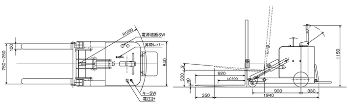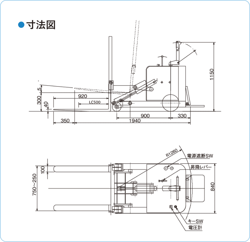 走行・上昇作業のすべてを手元に集中させています。ハンドルをにぎりながら操作がしやすい指先レバータッチノブ方式を採用しています。